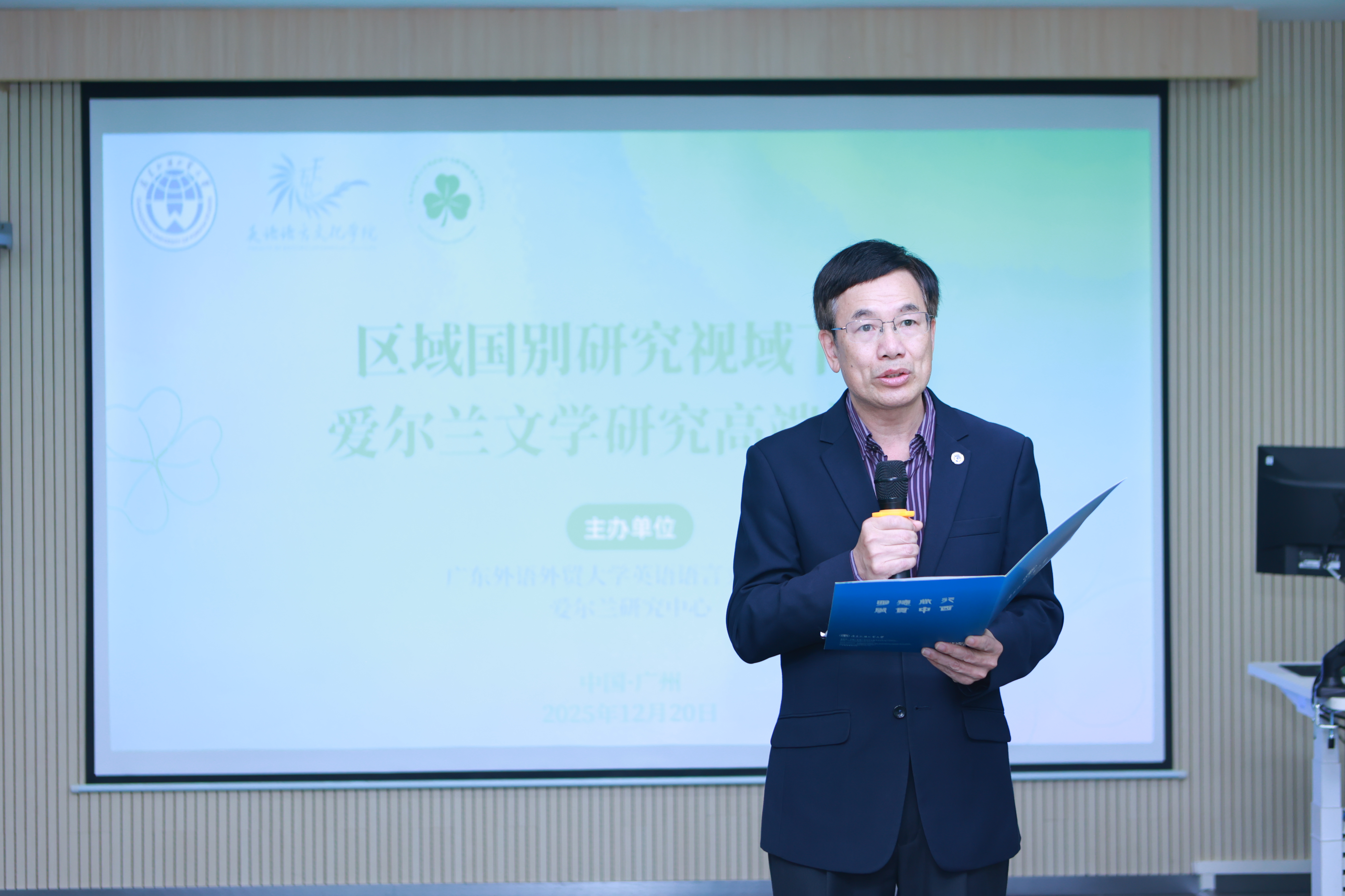 2025年12 月 20 日,由万博max体育官方网站爱尔兰研究中心主办的 “区域国别研究视域下的爱尔兰文学研究高端论坛” 在广州顺利举行。万博max体育官方网站副校长何传添教授、万博max体育官方网站主持工作副院长吴庄教授、《外国文学》主编、北京外国语大学张剑教授、北京外国语大学爱尔兰研究中心主任陈丽教授、南京大学全球人文研究院戴从容教授、西南交通大学外国语学院党委书记李成坚教授、湖南师范大学英国、爱尔兰中心主任曹波教授、山东大学外国语学院冯伟教授、上海戏剧学院期刊编辑中心秦宏教授等专家出席论坛。论坛汇聚了全国多所高校的专家学者和师生代表,通过主旨报告、分论坛研讨等形式,全方位探索爱尔兰文学研究的新路径、新范式,为新文科背景下的国别与区域研究赋能增效。论坛开幕式由英文学院爱尔兰研究中心主任李元教授主持,主旨报告环节分别由李元教授、上海戏剧学院期刊中心编辑秦宏教授主持。